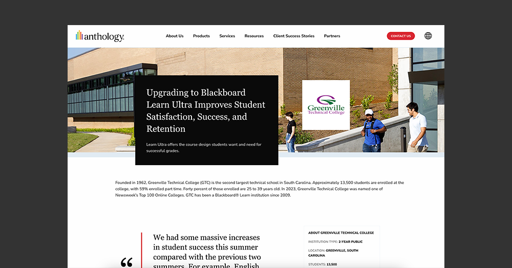 Greenville Technical College ran two test pilot semesters of courses comparing the success of courses that ran in Blackboard Learn Ultra to the previous LMS. The results indicated that Religion 201 experienced a 35.1% increase in success rates, while English 102 increased by 33.7%, and Math 110 increased by 27.2%.